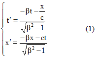 справедливые для v>c. Из преобразований (1) следует, что при движении со скоростью v>c происходит изменение знаков у времени "t" и координаты "x", что называется обращением времени и инверсией пространства соответственно. СРТ-теорема (теорема Людерса-Паули-Швингера) утверждает, что если при пространственно-временных преобразованиях наблюдается одновременное изменение знаков у координат и времени движущейся частицы, то обязательно происходит и изменение знака заряда частицы (зарядовое сопряжение), то есть частица превращается в античастицу ([1], [2]). Из чего следует, что преобразования (1) описывают движение античастицы.